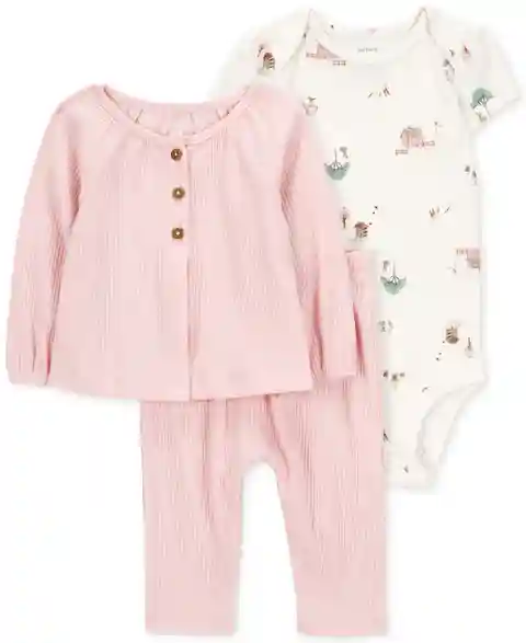 Give her a sweet and special look with this comfy three-piece Carter's set featuring a short-sleeve barn-print bodysuit to pair with easy-on ribbed pants and a button-front cardigan.