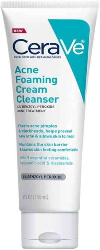 CeraVe's Acne Foaming Cream Cleanser gently yet effectively combats acne breakouts while preventing new blemishes. Its unique cream-to-foam formula utilizes 4% Benzoyl Peroxide to target and reduce acne-causing bacteria.Enriched with three essential ceramides, Niacinamide, and Hyaluronic Acid, this ...more