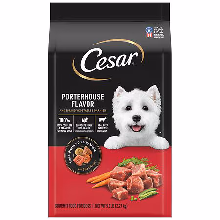 Give your dog a seat at the dinner table with CESAR Porterhouse Flavor and Spring Vegetables Garnish Dry Dog Food. Made with real beef as the first ingredient, this gourmet dog food features tender pieces that will make your dog dance around their bowl come dinnertime. CESAR Food for Dogs is also de...more