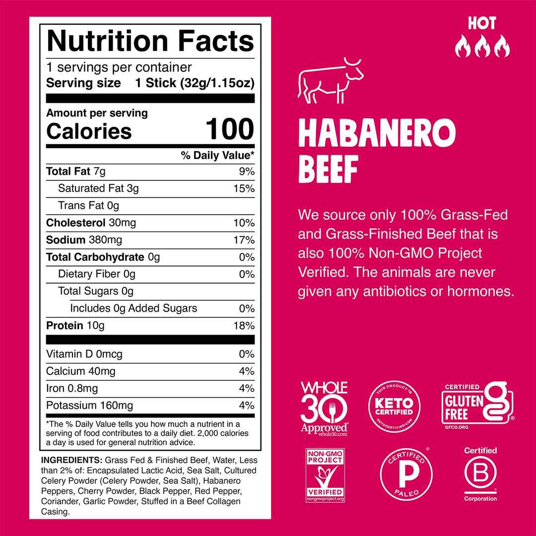 Crank up the heat! Taste our grass-fed and finished meat stick with the spiciest seasonings yet. Habanero, red pepper, and coriander turn up the dial for a deliciously spicy snack.