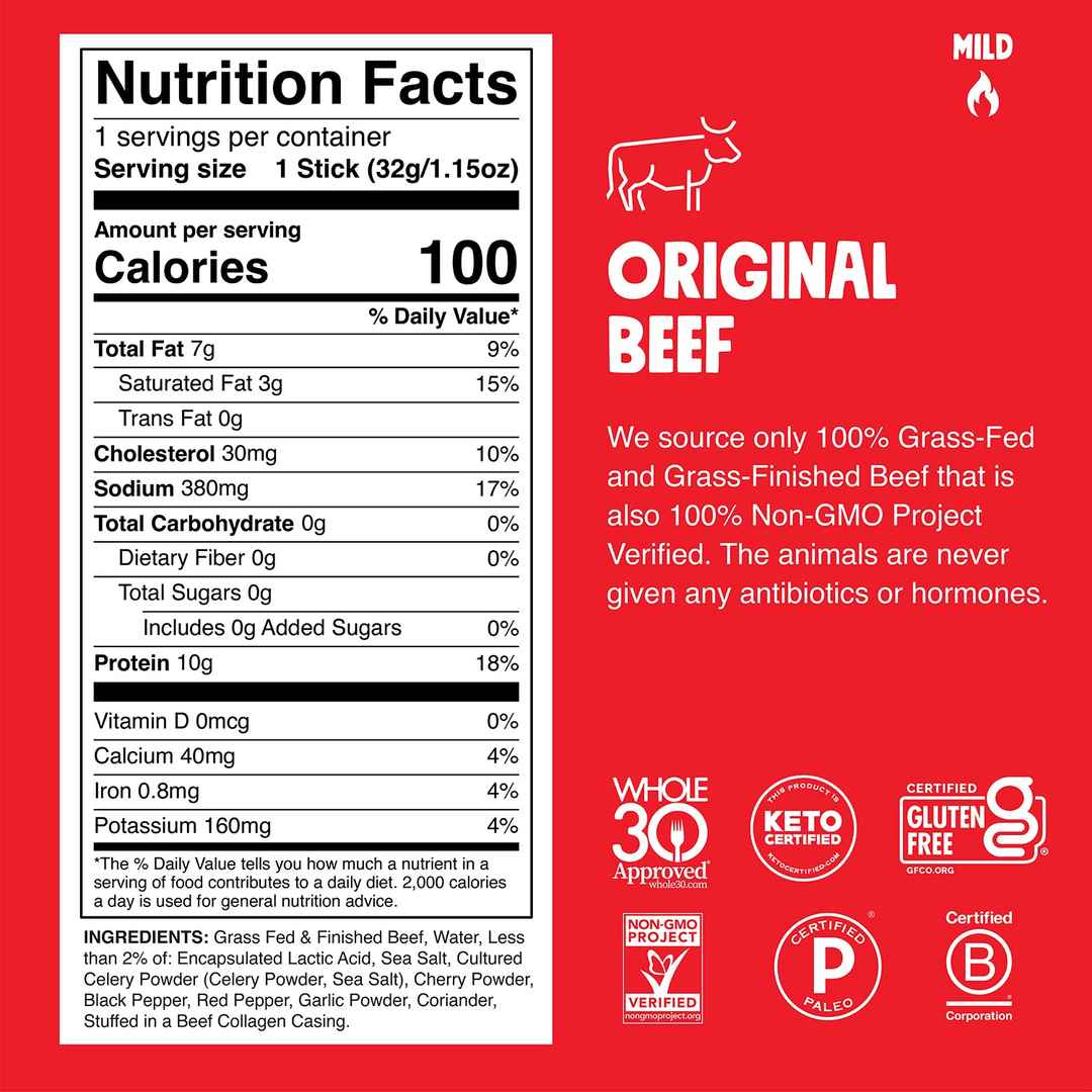 Our OG smoky beef jerky stick with black pepper spice. Chomp away! Original never goes out of style. Slightly smoky flavor with just a touch of spice.