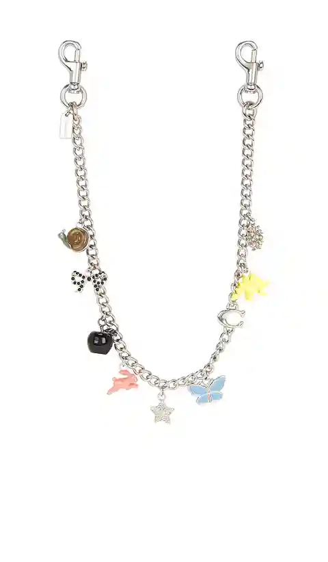 Coach Motif Chain Strap in Multi. Coach Motif Chain Strap in Multi. Plated metal, enamel, resin and glass motif links. Dog-leash clip and attached split keyring. One continuous chain charm with no compartments. Slim linear silhouette for hanging accessory. Swings freely when attached to bag or keys....more