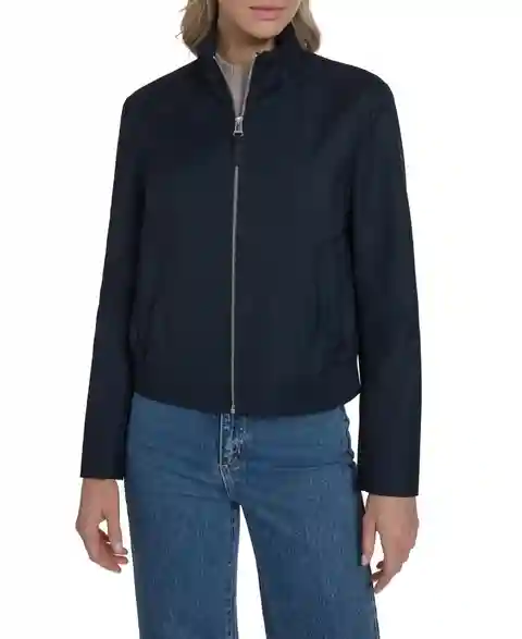 A sleek take on rainwear, this Cole Haan pin stripe rain bomber jacket features a modern zip-front design with a flattering, streamlined fit. Lightweight and versatile, it's perfect for staying polished on drizzly days.
