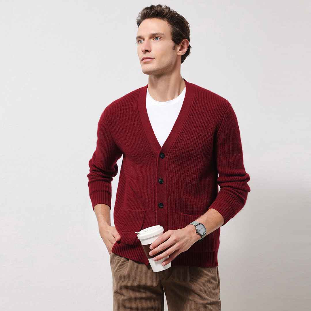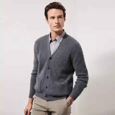 Luxurious 100% cashmere V-neck cardigan with a thick fisherman's rib stitch, versatile styling, and simple button accents. Perfect blend of warmth and elegance. Material: This cardigan is made from 100% high-quality cashmere, offering ultimate softness and warmth.V-Neck Design: The V-neck design all...more