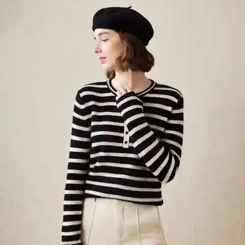 Stay cozy and stylish with our Cashmere Striped Knit Henley Sweater. This timeless piece is designed for both comfort and flair, with a soft, ribbed knit texture that feels gentle against your skin. Featuring classic horizontal stripes, the Henley neckline adds a touch of vintage charm while offerin...more