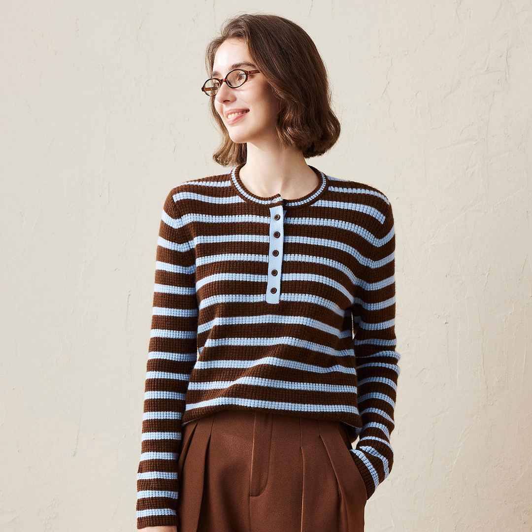 100% Cashmere Striped Knit Henley Sweater