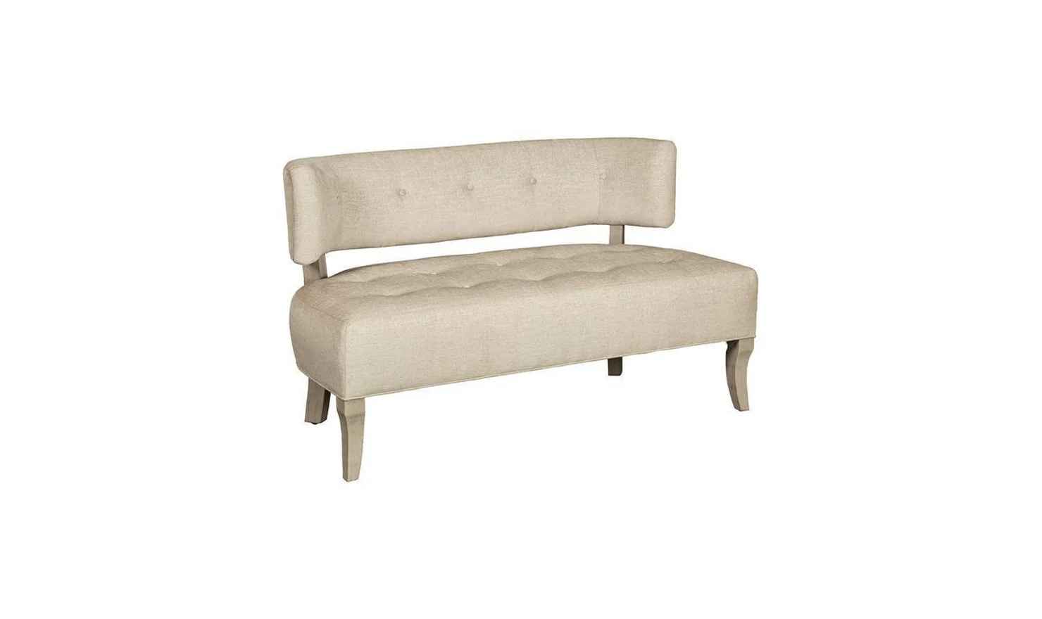 A great accent piece for any room in the house, this little settee has modern lines and character. It features a curved back and button detailing on the seat and back. Sleek shaping in the legs is the final touch of elegance on this beautiful piece. Add it to your bedroom, hallway or living space fo...more
