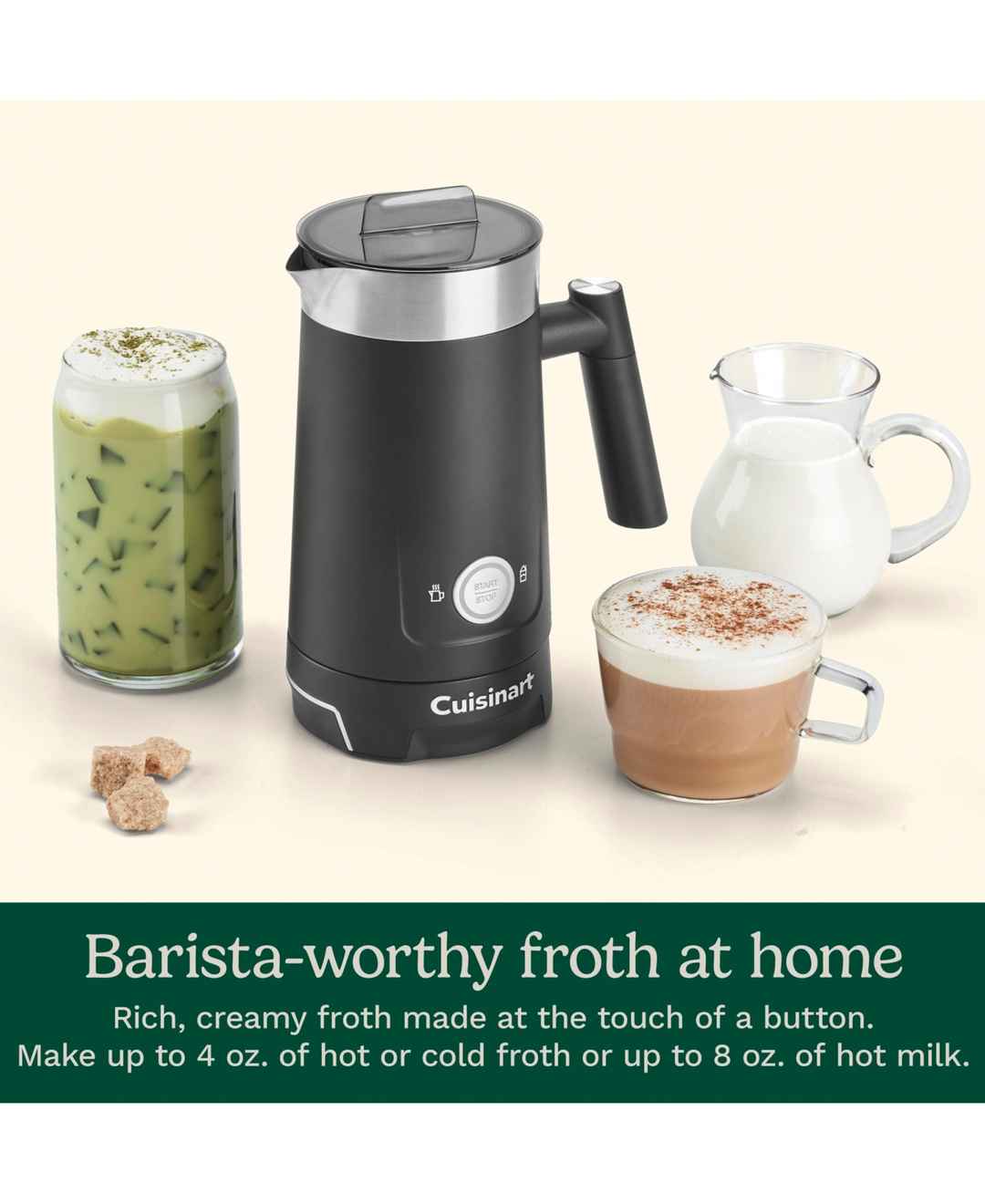 Perfect your latte art with this Cuisinart frother. With an easy-clean nonstick interior, it makes up to 4-oz. of foam at a time or heats up to 8-oz. of milk for cocoa or other beverages.