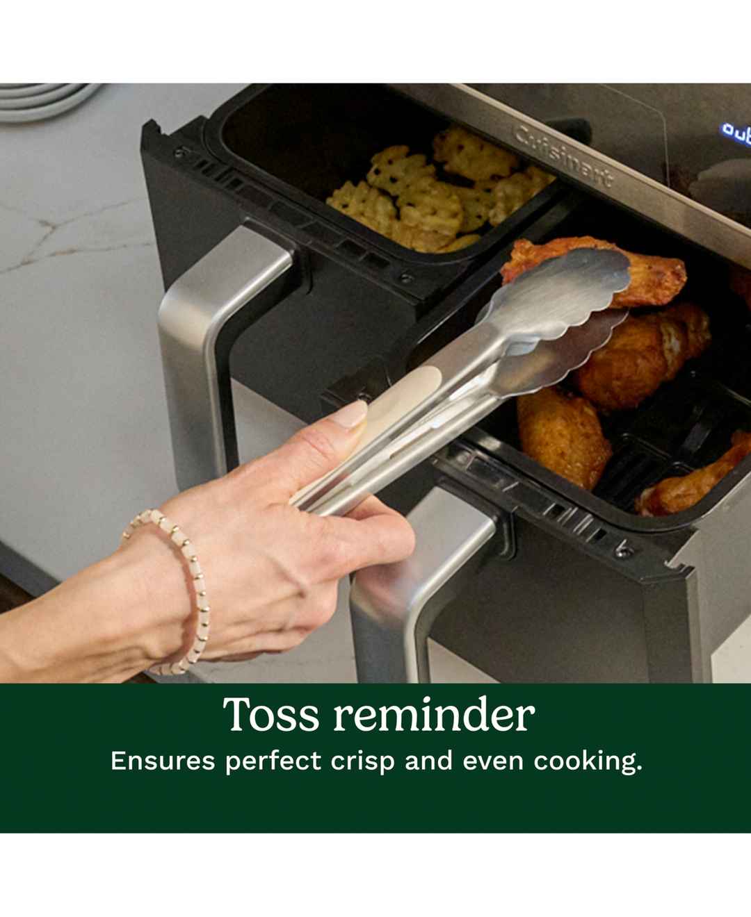 Prepare more food in less time with this Cuisinart air fryer, which is designed with dual baskets, allowing two different foods to cook simultaneously at separate times and temperatures. Six cooking functions, along with a toss reminder, auto-pause, and auto-warm, simplify meal preparation. Model nu...more