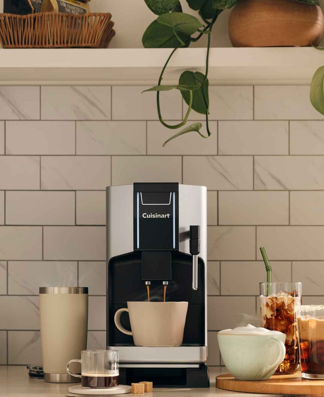 Cafe-style convenience begins with this Cuisinart Espresso Bar fully automatic machine designed for one-touch brewing. Built-in stainless steel grinding and precise pressure deliver balanced flavor, while milk frothing expands drink options. Model Number: Em-550.