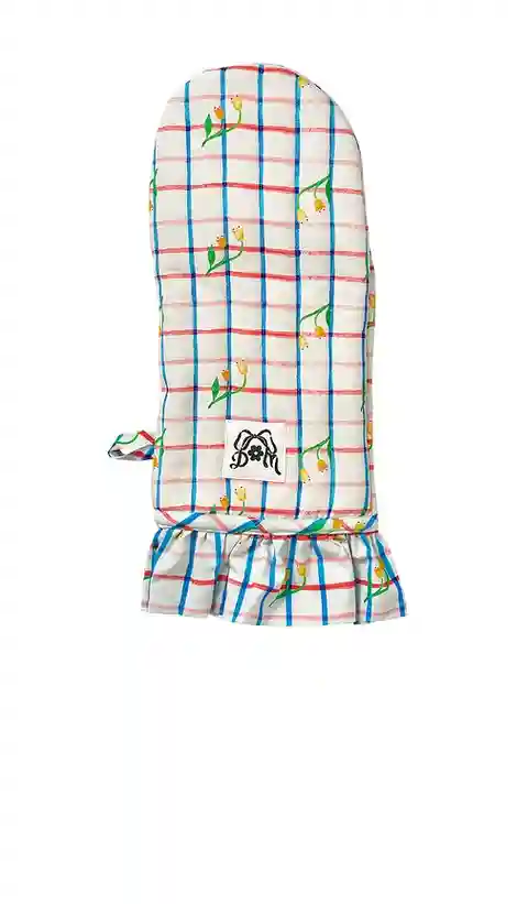 Damson Madder Single Oven Mit in White. Damson Madder Single Oven Mit in White. Crafted with care and designed in London, this hand-painted print oven mitt brings a touch of quaint to your kitchen. The quilted cotton design ensures both comfort and durability, while the charming ruffle edge detail a...more