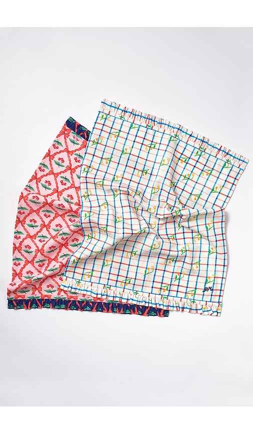 Damson Madder Set Of 2 Tea Towels in Pink. Damson Madder Set Of 2 Tea Towels in Pink. Bring a cheerful touch to your kitchen with this hand-painted print tea towel set, designed in London. Featuring a playful cherry print and a timeless check print, both towels are finished with a charming ruffle ed...more