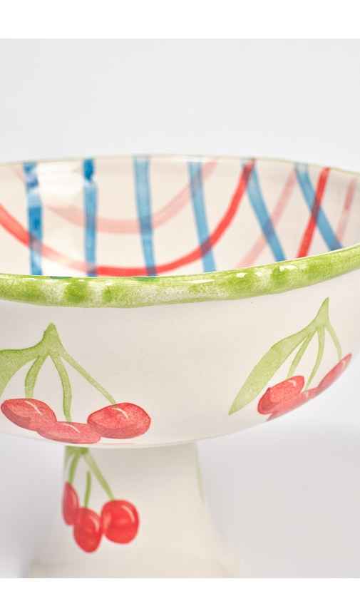Damson Madder Hand Painted Frilly Pedestal Bowl in White. Damson Madder Hand Painted Frilly Pedestal Bowl in White. Add a sweet touch to your serve ware with this intricately hand painted bowl, featuring an elegant pedestal base and a charming frilled edge. Adorned with checks and cherries, it's per...more