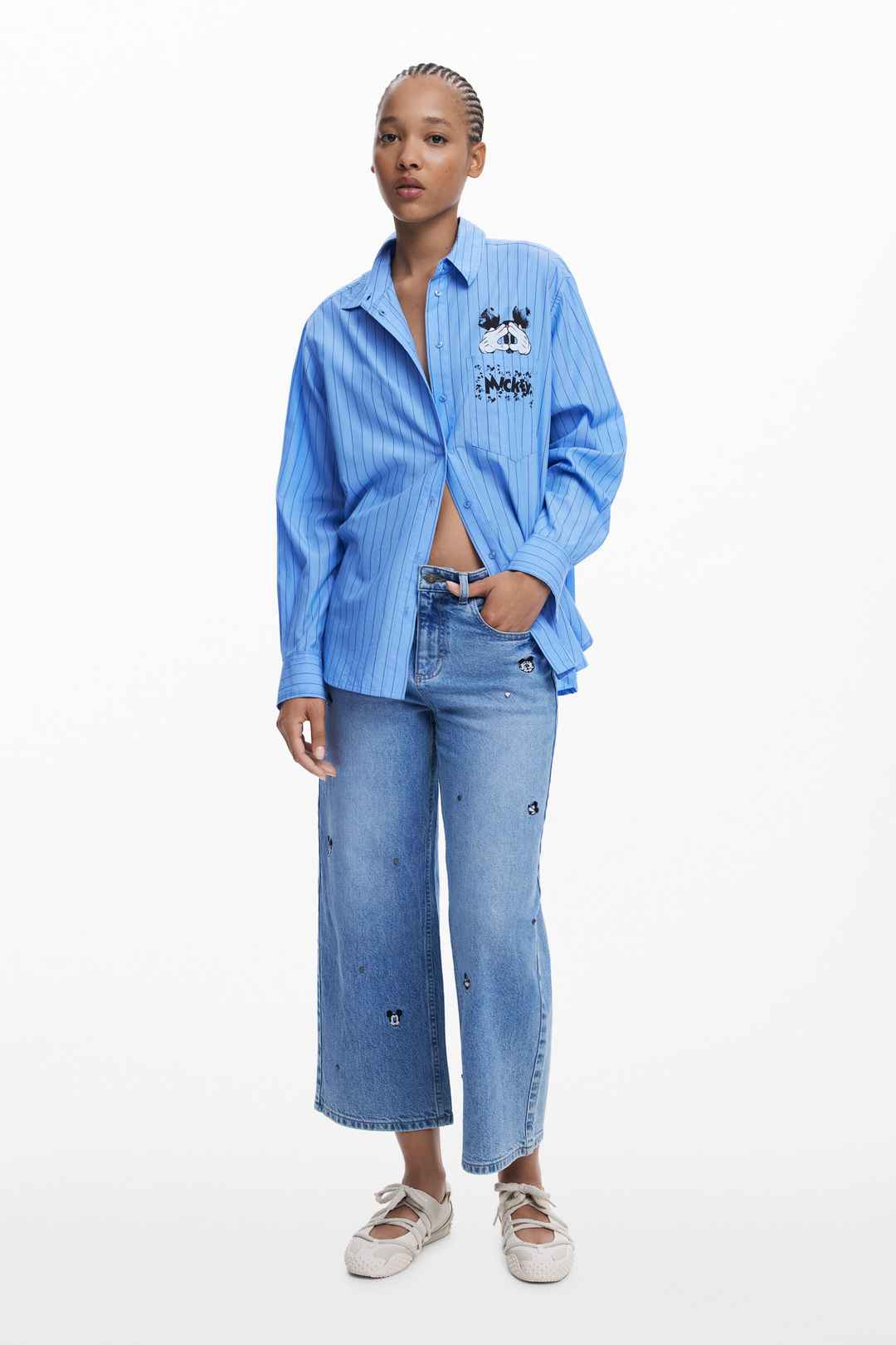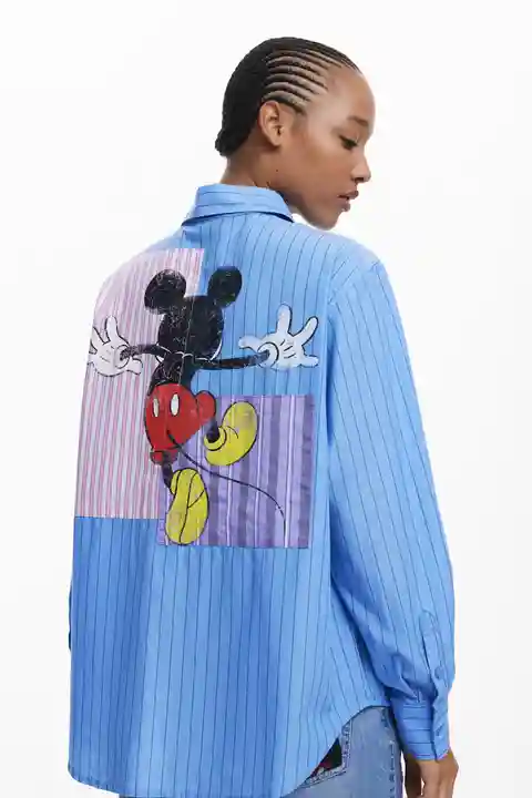 Oversized long-sleeve shirt, front pocket, in blue color with pinstripe and Mickey Mouse print.