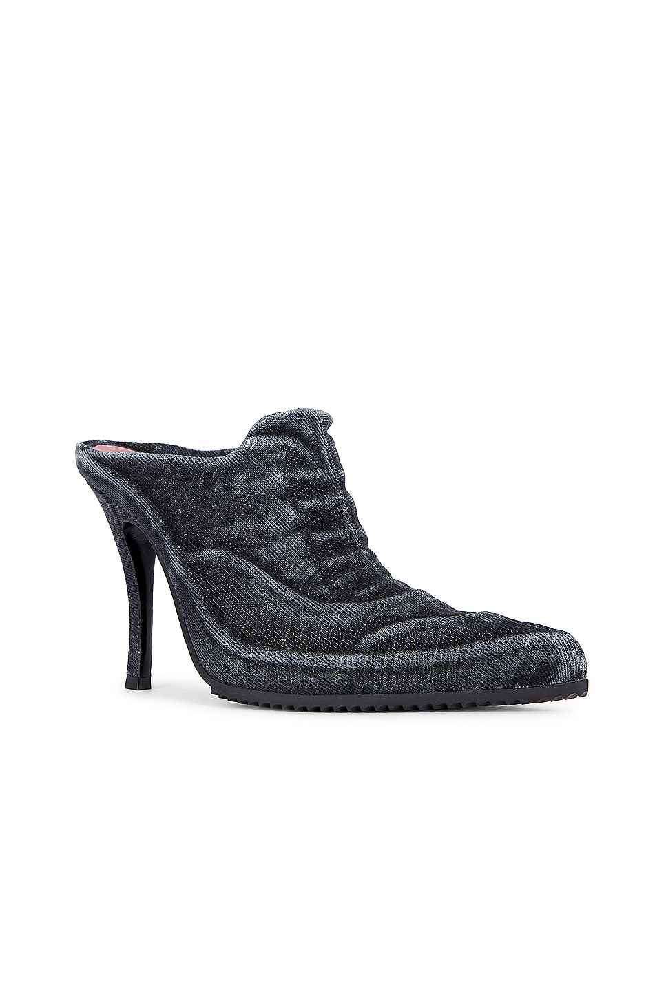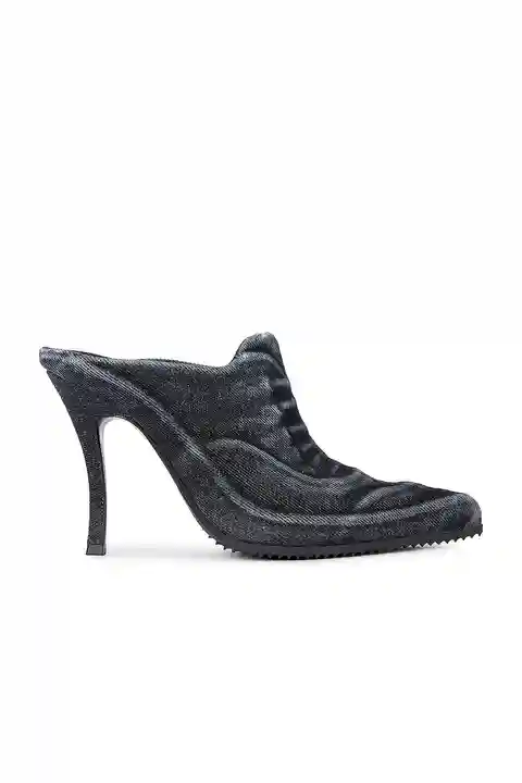 Diesel Cloud Mule in Black Denim fabric upper and rubber sole. Made in China. Pointed toe. Rubber tap heel. Approx 100mm/ 4 inch heel. DIEF-WZ8. Y03389-P6737-T8013. About the designer: