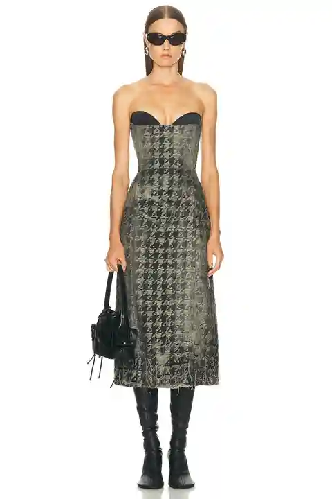 Diesel Strapless Midi Dress in Black Self 1: 100% cotton Self 2: 50% cotton 40% lyocell 10% modal Self 3: 92% rayon 8% spandex Self 4: 71% polyester 29% elastane. Machine wash. Partially lined with bustier. Exposed back zipper closure. Worn-in texture and floating threads. Destroyed fix denim fabric...more
