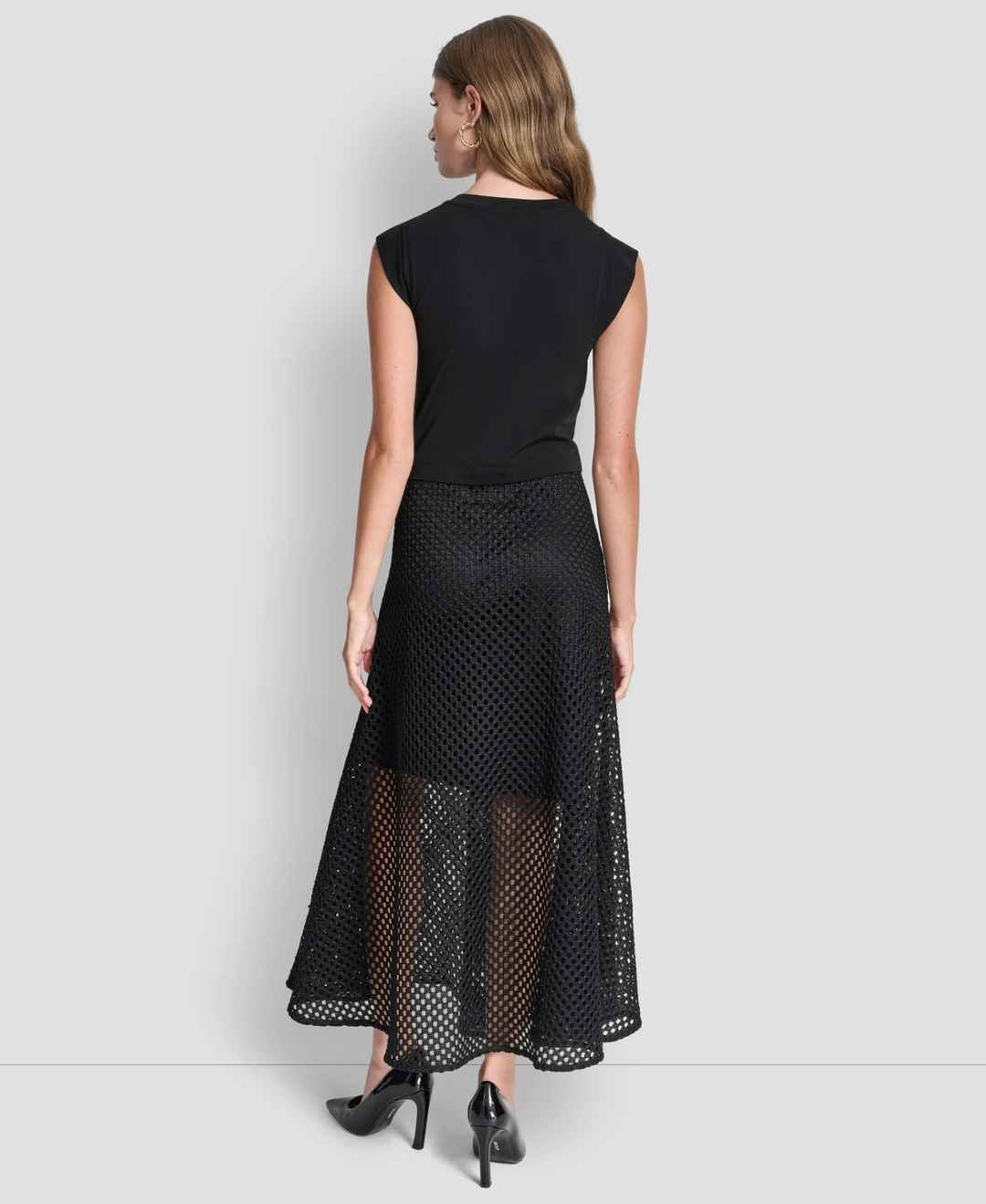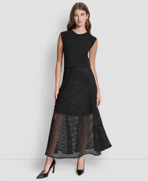 Showcase a modern aesthetic in this Dkny mixed-media dress, designed with a sleeveless cut. The choker neckline and sheath silhouette create a sophisticated, architectural look.