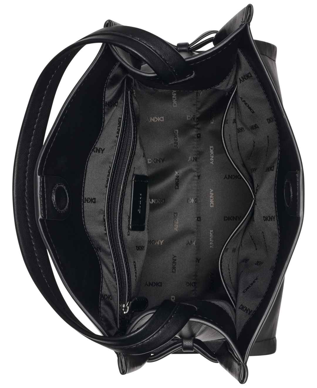 Modern utility shapes this Dkny bucket bag, with a top handle and snap closure for a secure, grab-and-go functionality. Medium proportions fit a tablet with ease, and exterior slip pockets keep essentials within reach.