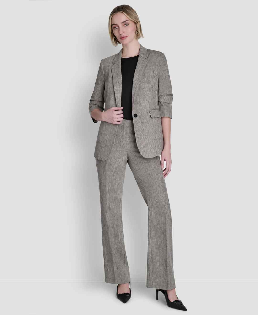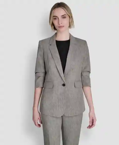Feel polished and powerfully refined wearing this classic single-button blazer from Dkny featuring a notch collar. It is the ultimate boardroom-to-brunch staple and features structured shoulders for a sophisticated look.
