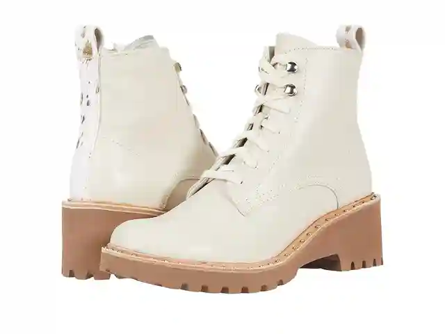 Grab a pair of these retro inspired Dolce Vita Hinto lug heel combat boots. These will make the perfect addition to all your fall-inspired outfits. Pull-on styling with a lace-up closure. Haircalf leather upper with small embellishments at the base. This product contains real fur: Calf, dyed and tre...more