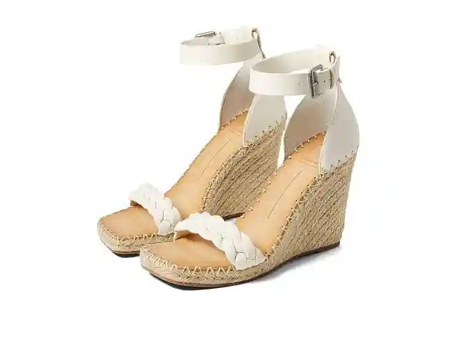 A pair of classic Dolce Vita Nilton heels for any occasion. Leather and synthetic upper. Leather/synthetic lining and insole. Slip-on/buckle strap closure. Square-shaped toe design. Single braid strap design at the front. Stitched detailing along the sides. Wedge heels. Synthetic outsole. Imported. ...more