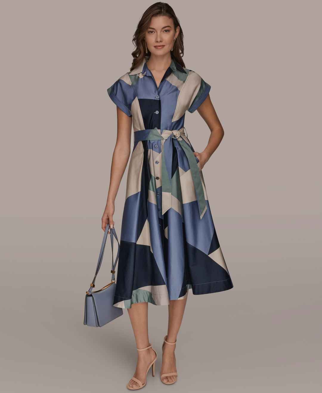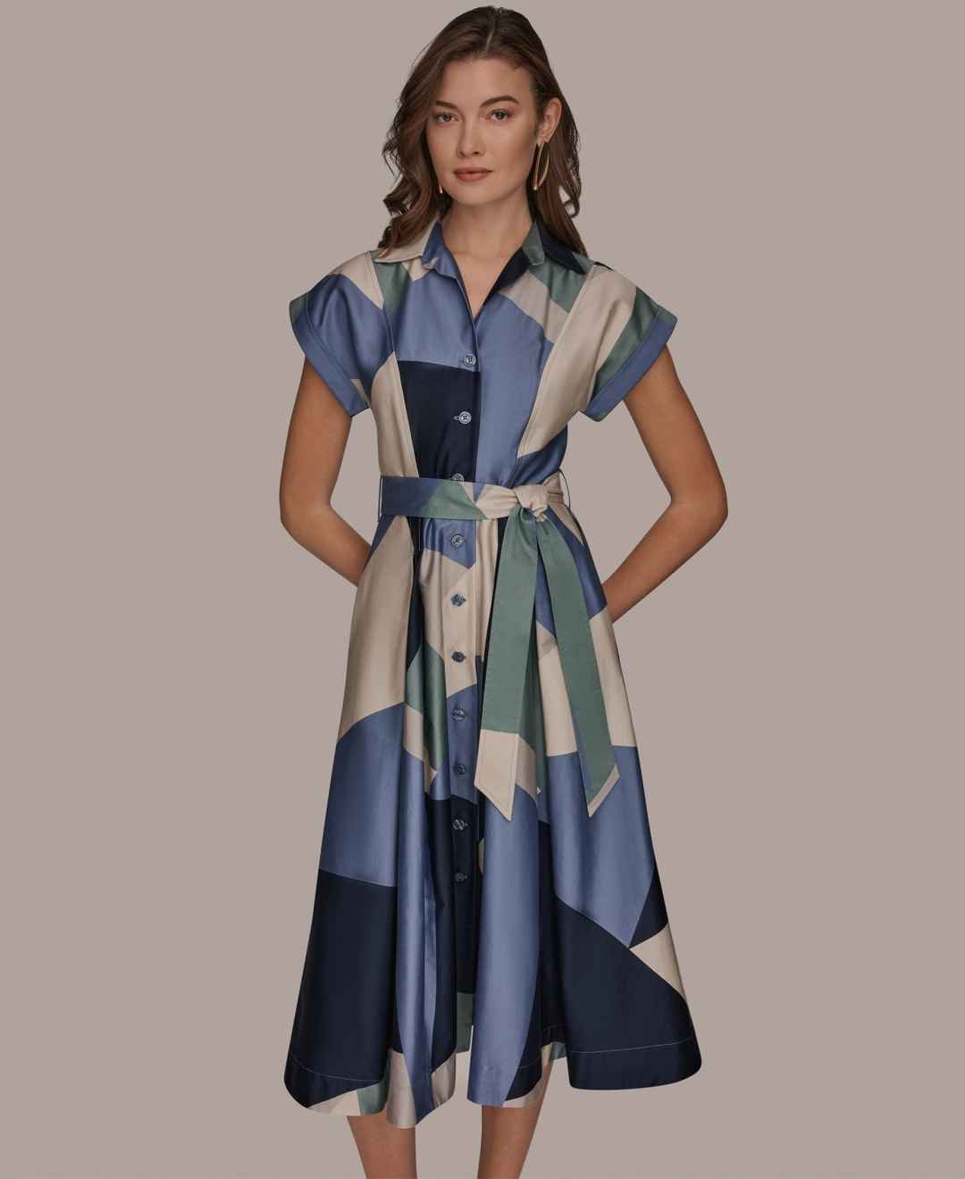 Donna Karan New York Women's Cap-Sleeve Spread Collar Geometric Colorblock Midi Shirt Dress - Tempest Multi