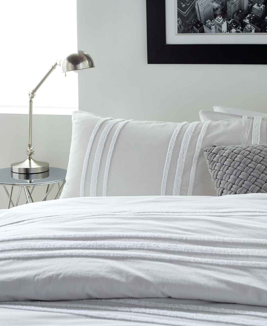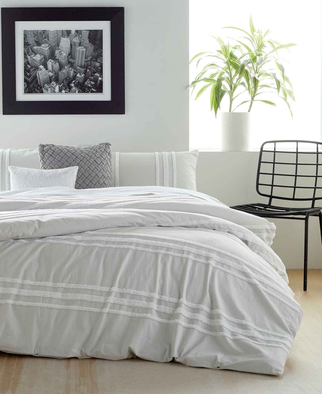 A modern take on a classic technique is presented in the Dkny Chenille Stripe Comforter Set. A horizontal white chenille stripe on a soft grey ground gives a crisp presentation to this woven fabric, while the coordinating shams tie the ensemble together with their opposite vertical stripes. Availabl...more