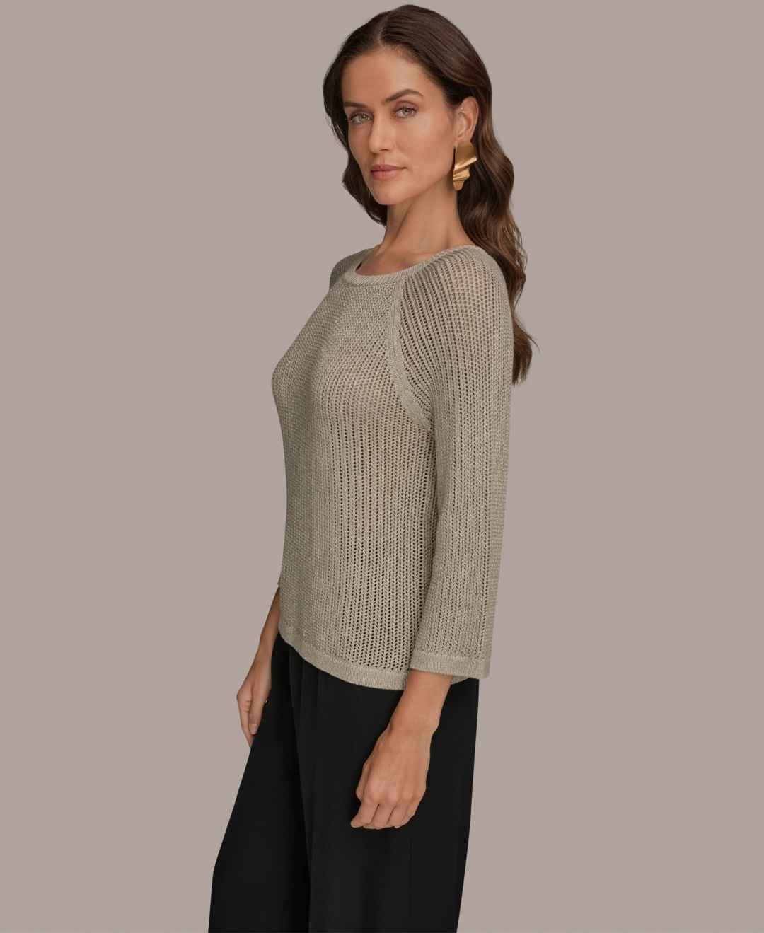 Subtle shimmer and a streamlined silhouette define this Donna Karan New York petite sweater top. Designed with a classic crewneck and short sleeves, it delivers a comfortable fit, while the soft metallic-infused knit adds a touch of elegance.