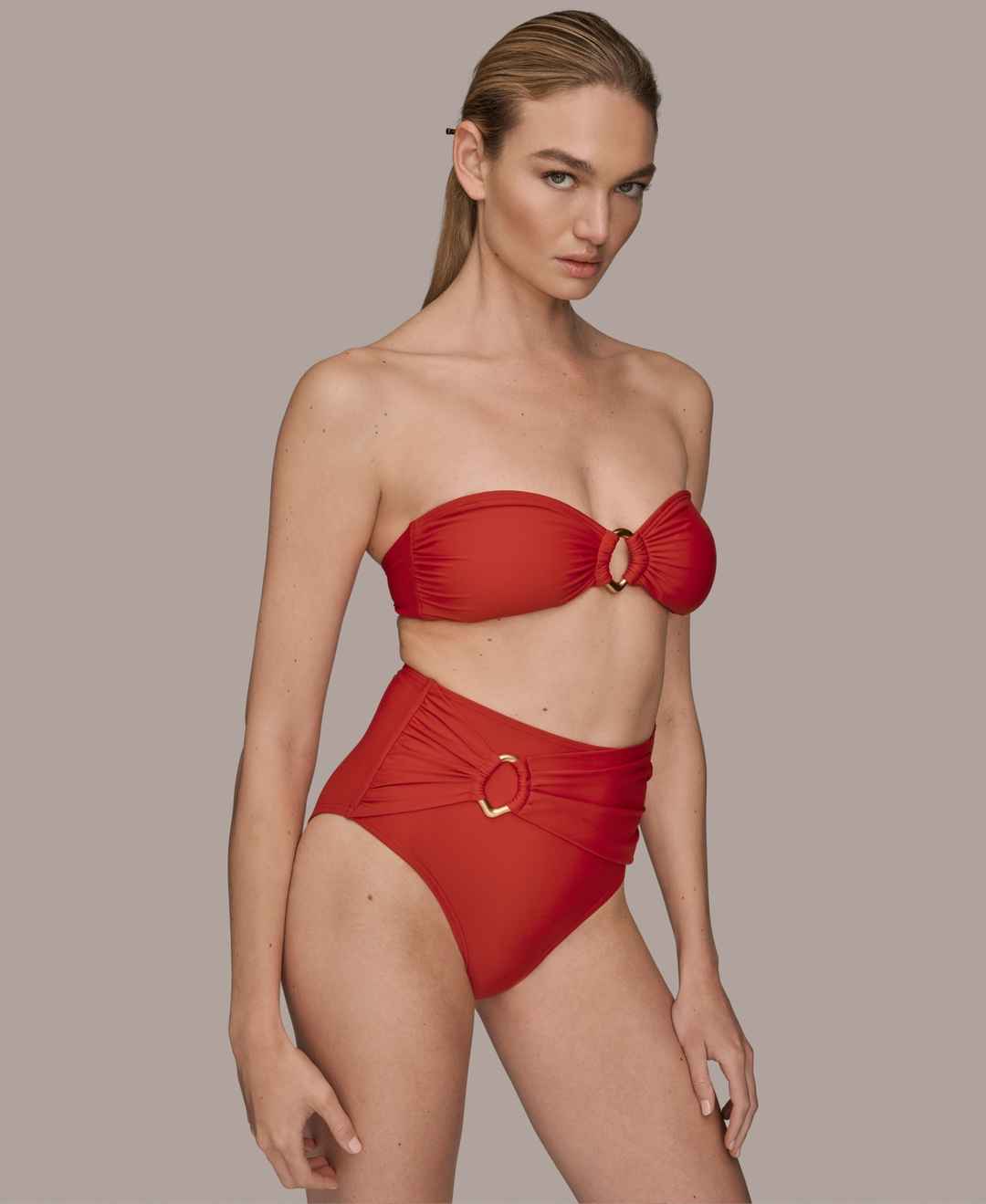 Elevate your swim style with this Donna Karan shirred bandeau top, featuring adjustable straps for versatile, customizable looks. Removable soft cups provide tailored support, combining comfort and flattering shape for a chic, effortless poolside or beach-ready ensemble.