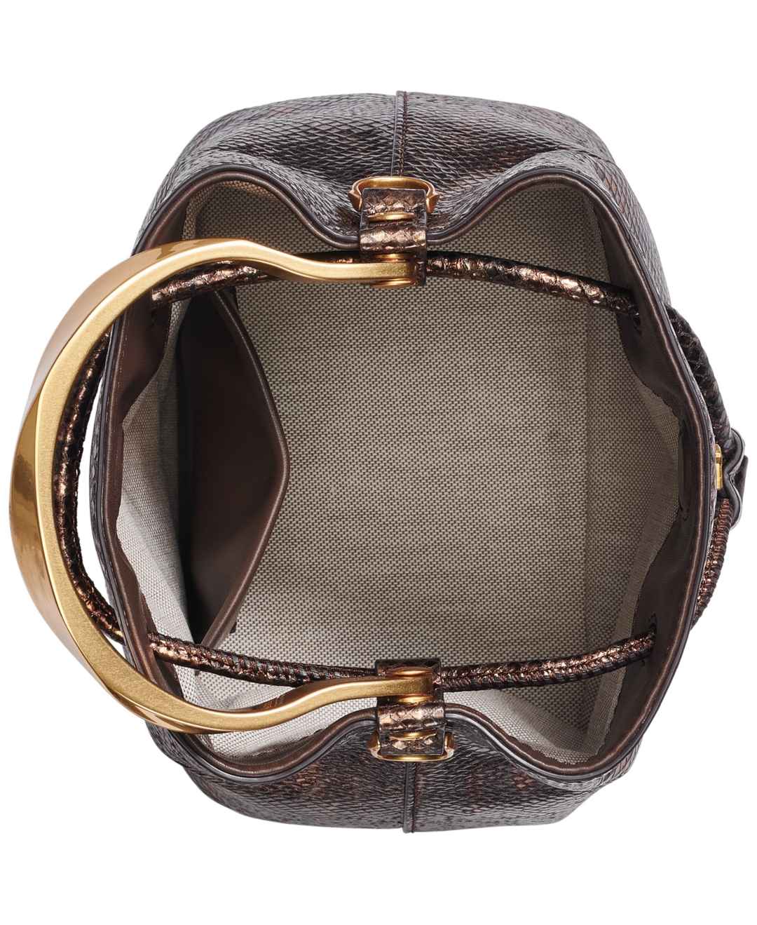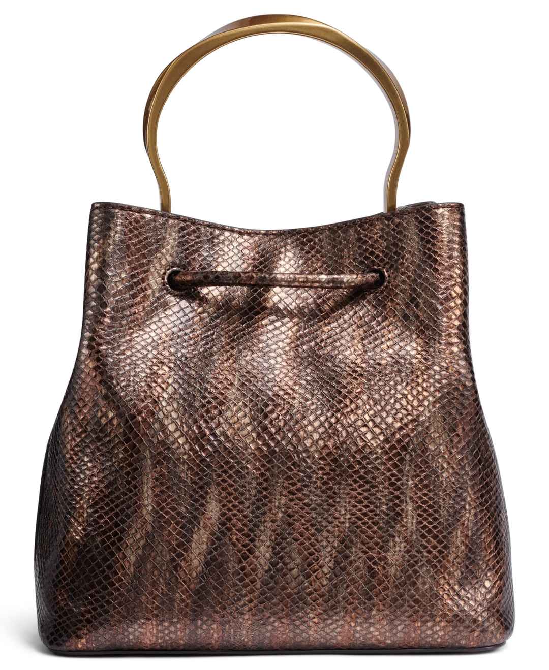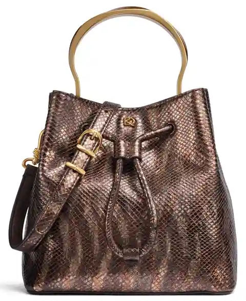 This gold-tone metallic snake, top handle bucket bag by Donna Karan with a drawstring front detail is the perfect accessory for elevating any chic look