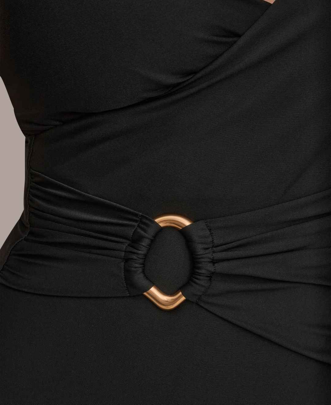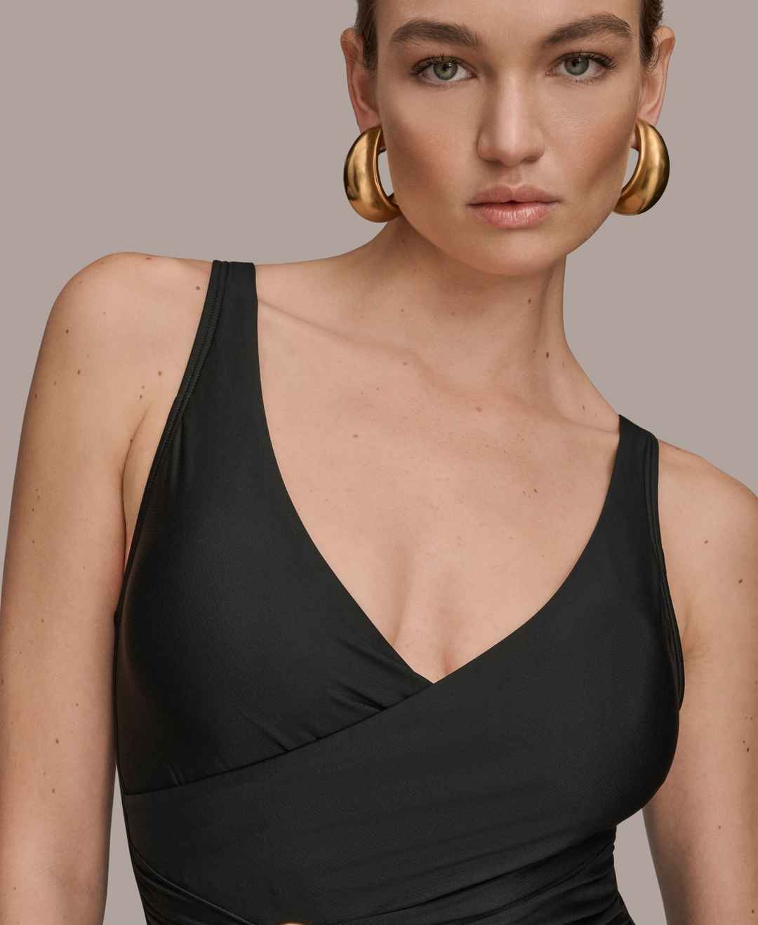 Constructed with a wrap front and v-neck, this Donna Karan one-piece swimsuit combines style and comfort with adjustable straps and a sophisticated ring detail. The removable soft cups provide customizable support, ensuring a flattering and secure fit.