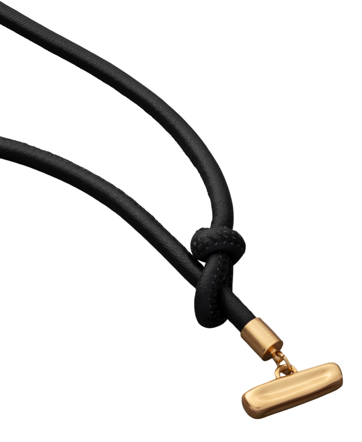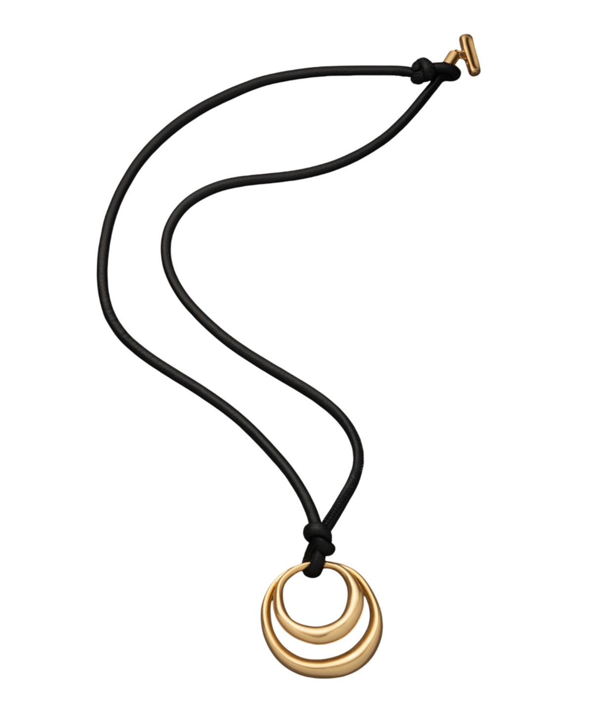 Define modern elegance with this Donna Karan necklace featuring a multi-row pendant for striking dimension. A toggle closure and gold-tone mixed-metal band paired with leather create distinctive texture with secure wear.