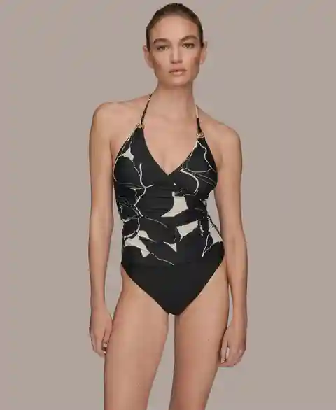 Hit the beach with confidence wearing this Donna Karan swim tankini top that features adjustable neck ties and removable soft cups for a customizable fit. Designed without underwire and hitting at the hips, it offers comfortable support and a flattering silhouette.