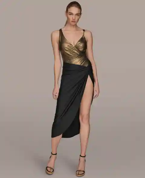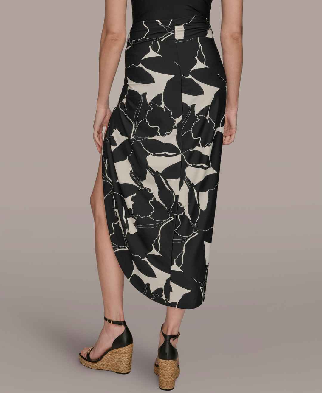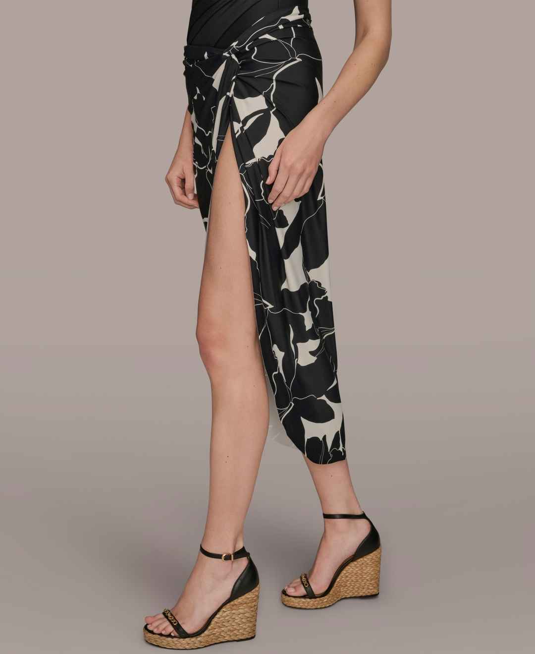 Designed as a draped side-slit sarong, this Donna Karan pull-on skirt introduces a touch of resort-ready elegance. The graceful drape creates a fluid and dynamic movement.