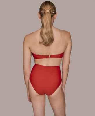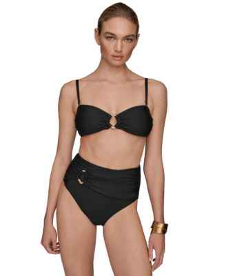 Elevate your swim style with this Donna Karan shirred bandeau top, featuring adjustable straps for versatile, customizable looks. Removable soft cups provide tailored support, combining comfort and flattering shape for a chic, effortless poolside or beach-ready ensemble.