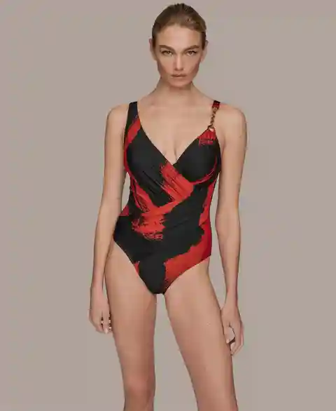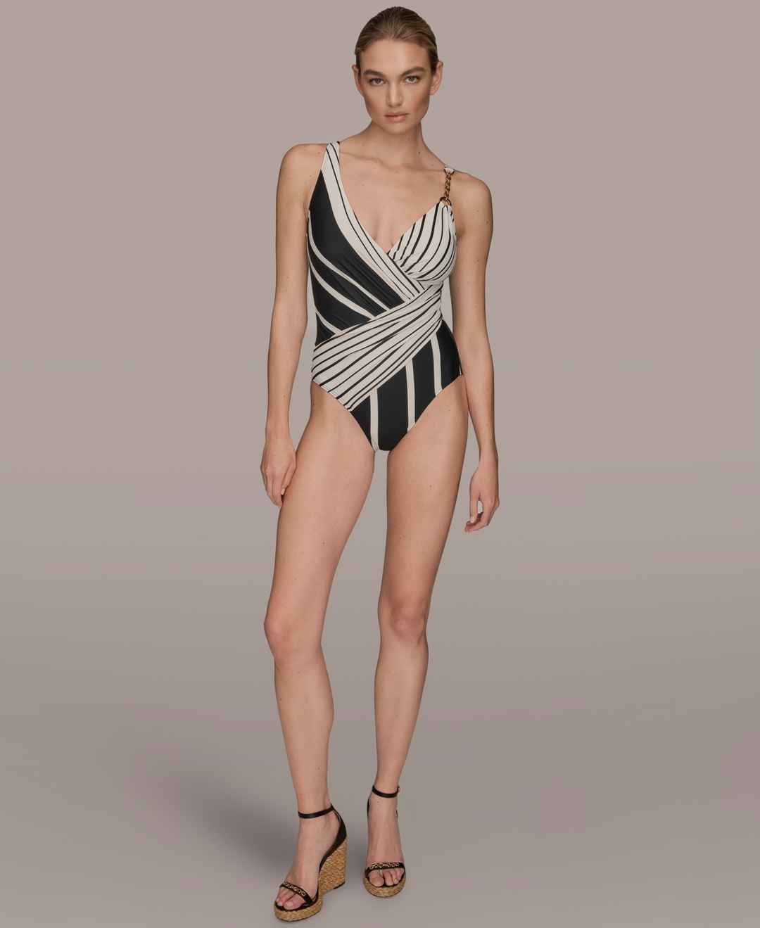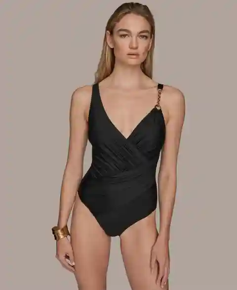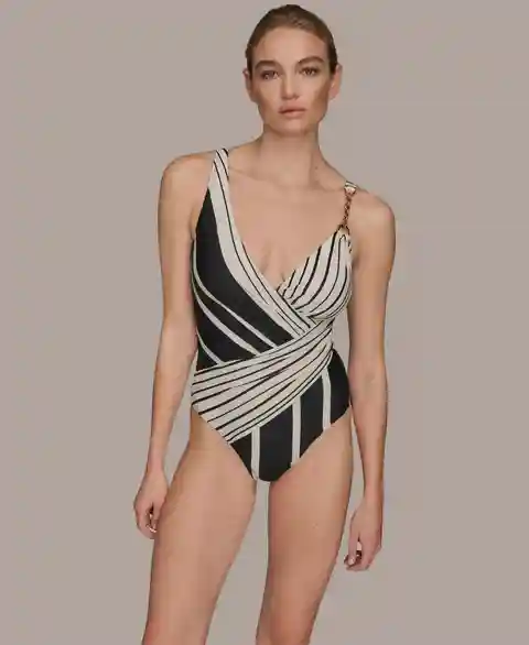 Made with a wrap front, this Donna Karan swimsuit features adjustable straps and removable soft cups. A delicate chain detail adds a sophisticated accent to the design.