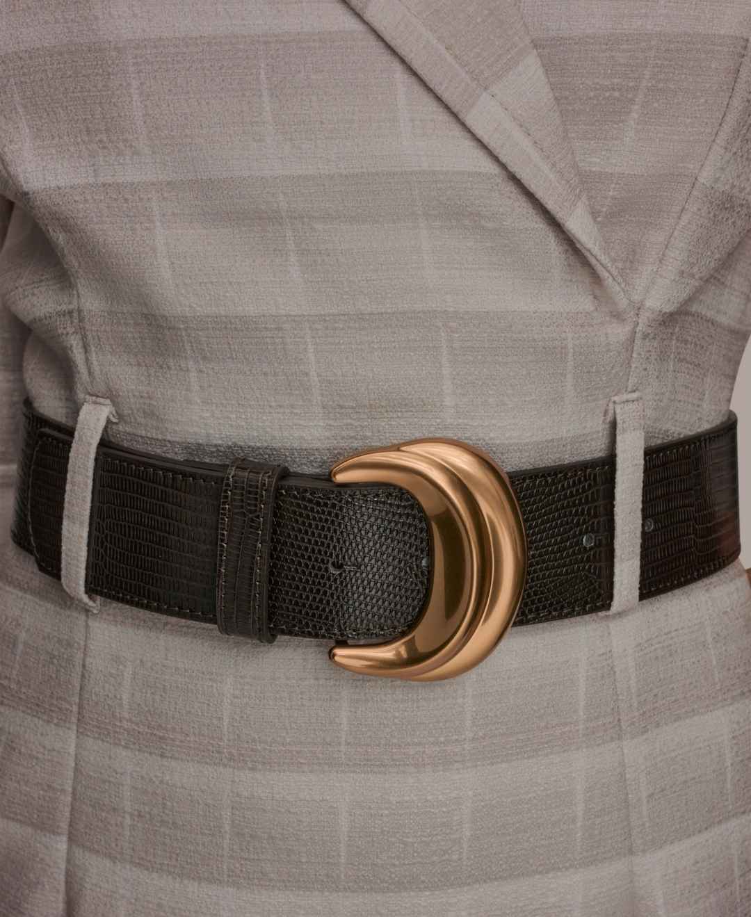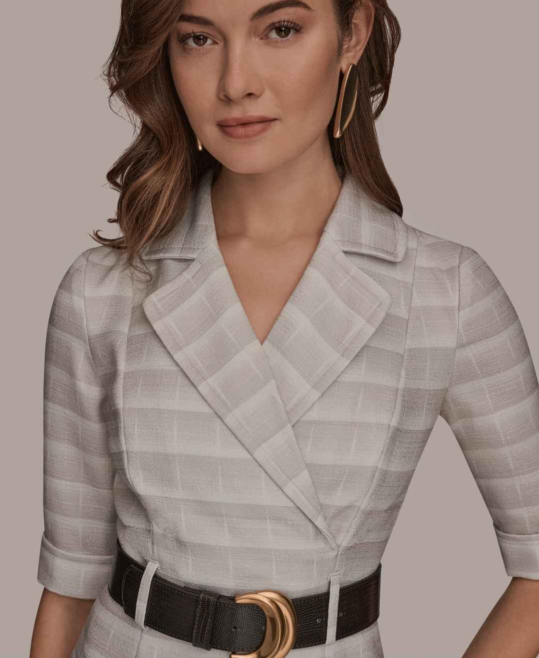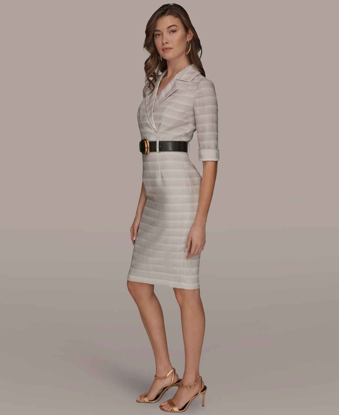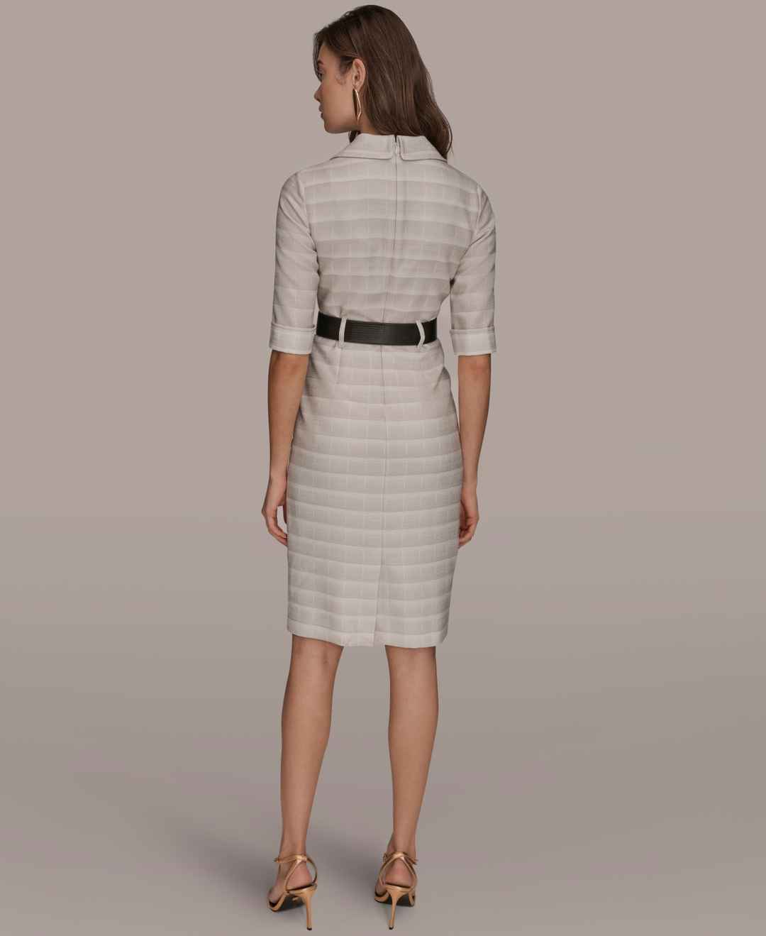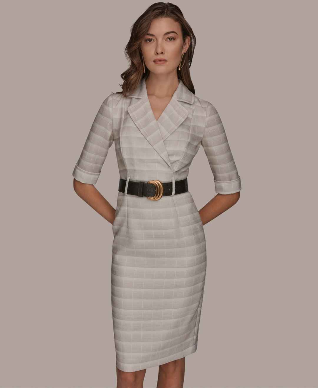 Command confidence in this Donna Karan New York dress, featuring a notched lapel collar and 3/4-sleeves. The removable wide belt and sheath silhouette create a structured, professional look.