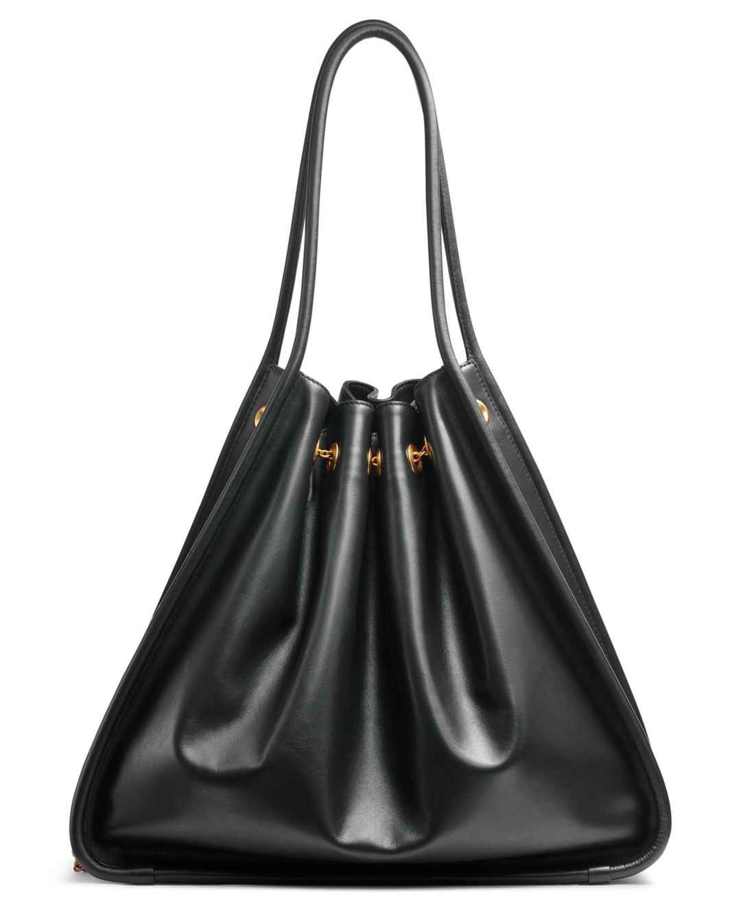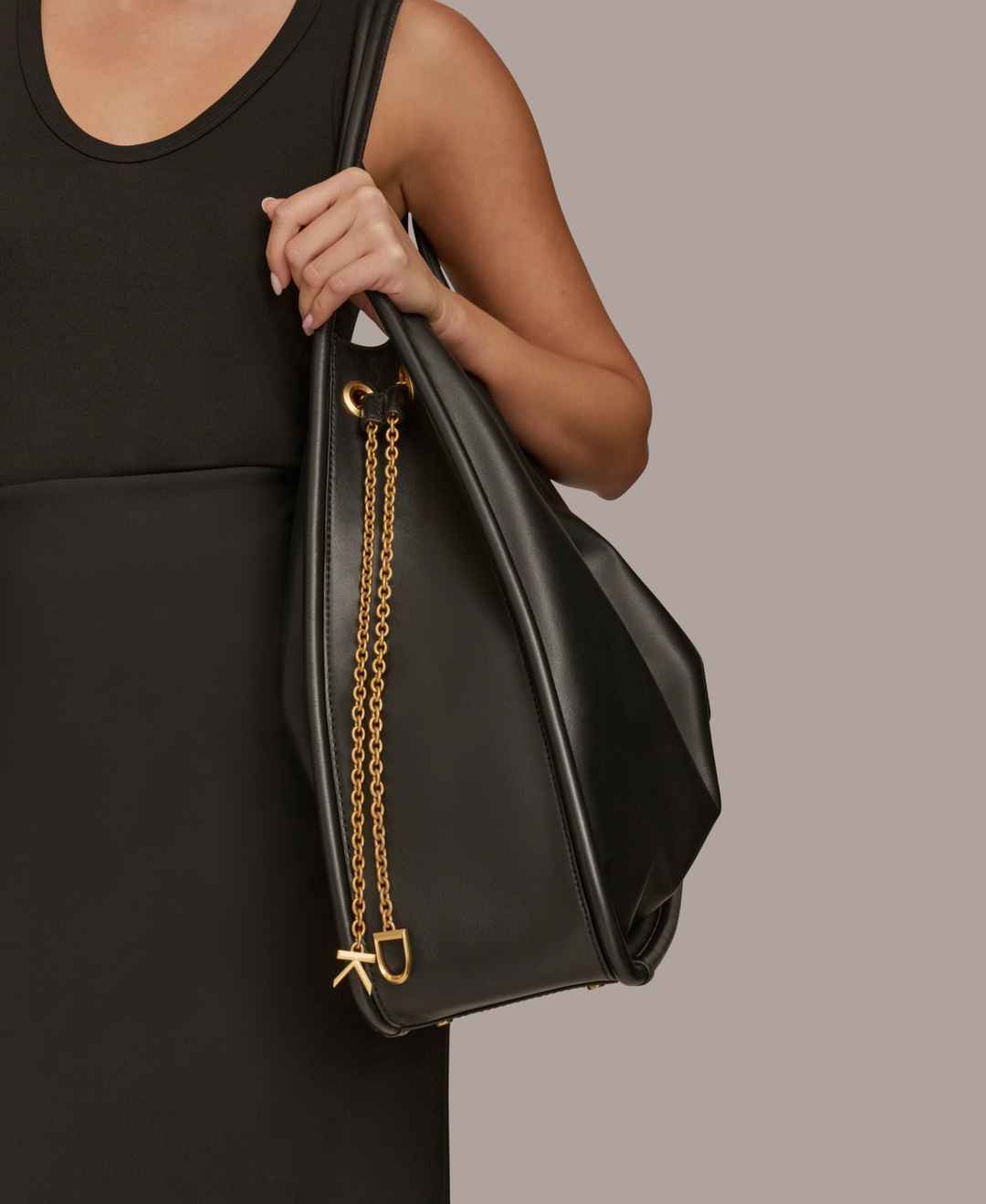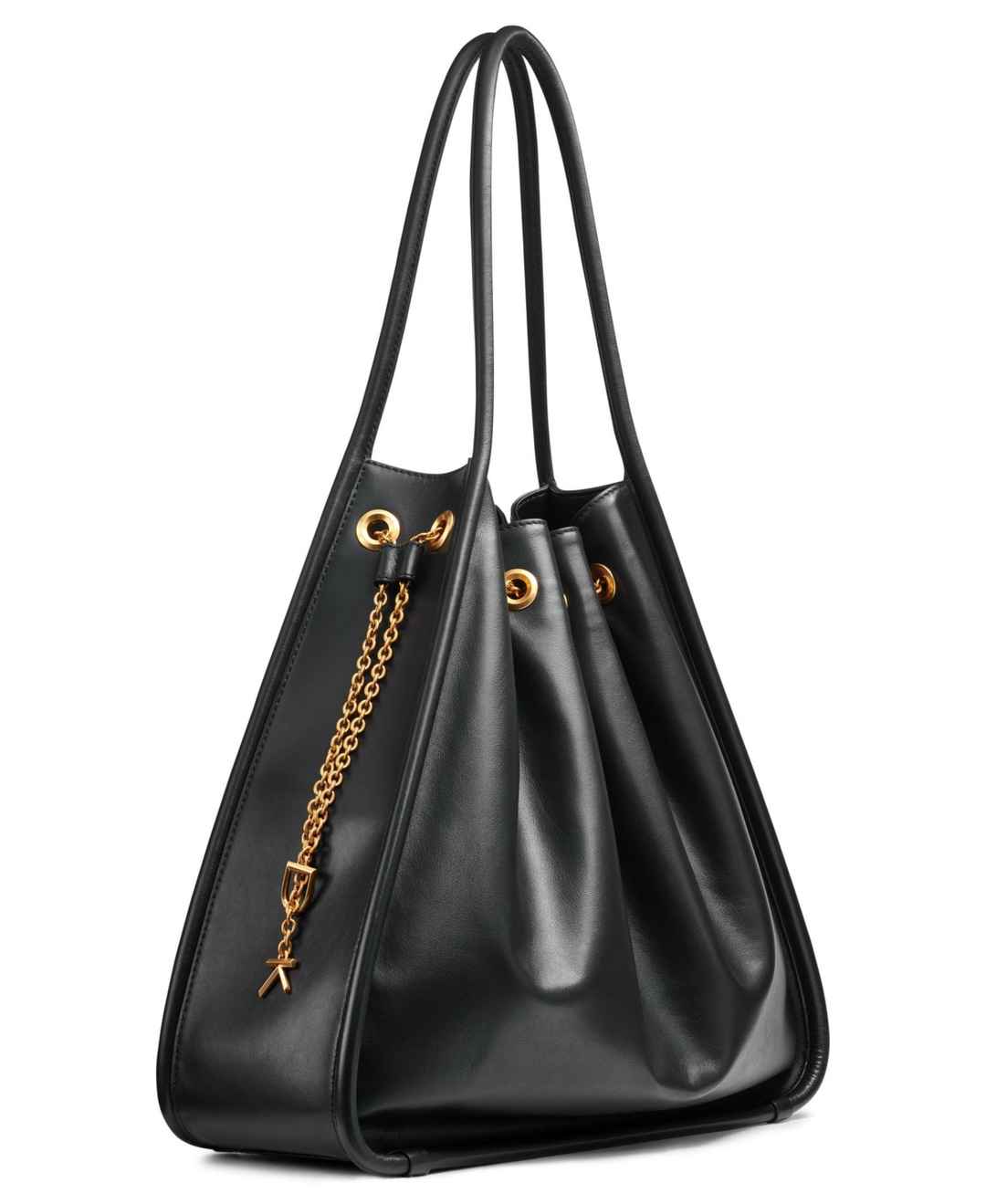 Crafted in leather, this tote by Donna Karan is super chic and features a functional interior with a gold-tone chain strap with signature Dk charms.