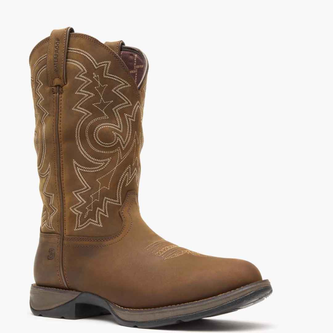 This is the mens 12 Western Waterproof Coyote Brown Rebel. This style has distressed full-grain leather with a waterproof membrane bootie inside to keep your feet dry all day long. It has a contoured, ventilated, and removable cushion footbed, cushion flex insole, a fiberglass shank and a rolled ...