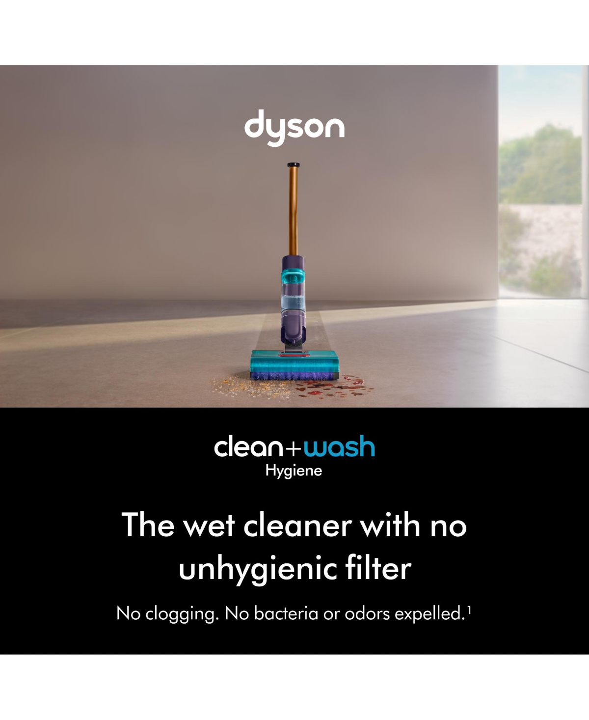 Dyson Clean+Wash Hygiene is the wet cleaner with no unhygienic filter. No clogging. No bacteria. No bad smells emitted. Unlike other machines which depend on dirty exhaust filters that accumulate sludge, bad smells, and bacteria, Dyson Clean+Wash Hygiene's hygienic system keeps waste in the cleane...more