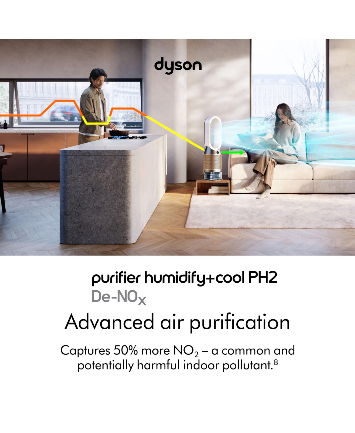 Dyson Purifier Humidify+Cool PH2 De-NOx purifies and hygienically humidifies the whole room. It also cools you. Hygienically removes 99.9% of bacteria in the water. Removes odors and gases, and continuously destroys formaldehyde. Advanced air purification captures 50% more NO . The fully sea...more