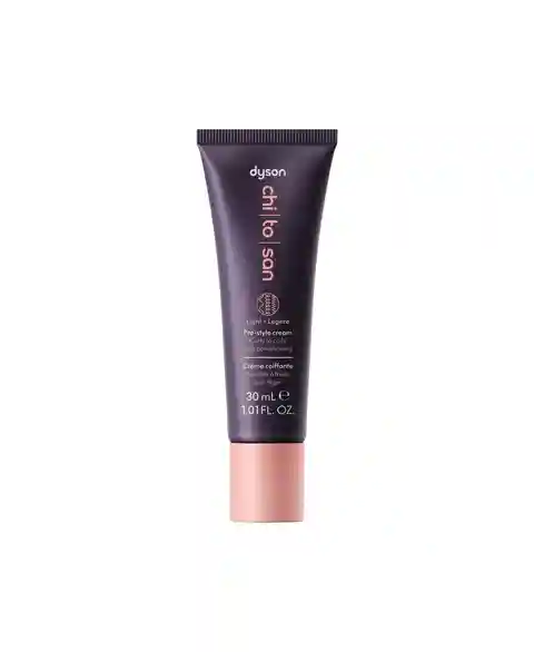 Dyson Chitosan Pre-style cream travel mini, Curly to Coily, Light Conditioning is developed for hair that naturally forms spiral curls and ringlets, tighter corkscrew or S-curls, or closely coiled Z-patterns. Best suited to thinner hair strands that are easily weighed down. Conventional retention pr...more