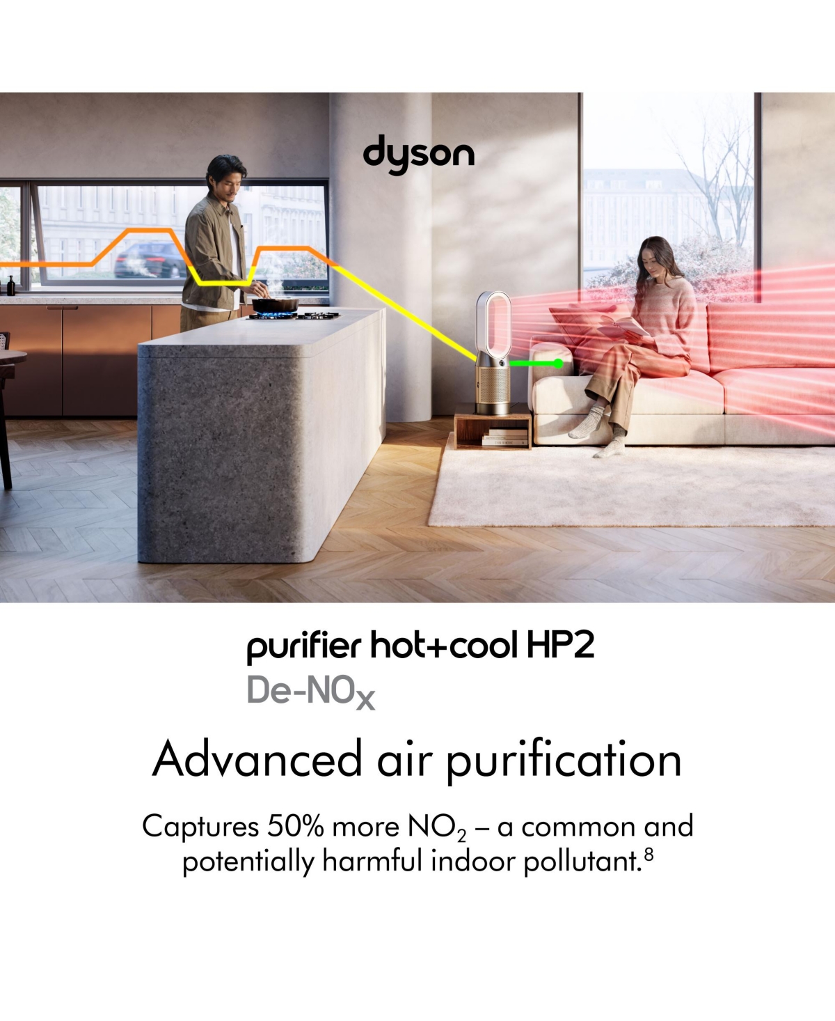 Dyson Purifier Hot+Cool HP2 De-NOx delivers whole-room heating and powerful cooling with purified air. Advanced air purification captures 50% more NO . Removes odors and gases, and continuously destroys formaldehyde. The fully sealed, 3-stage filter system captures 99.97% of particles as small...more