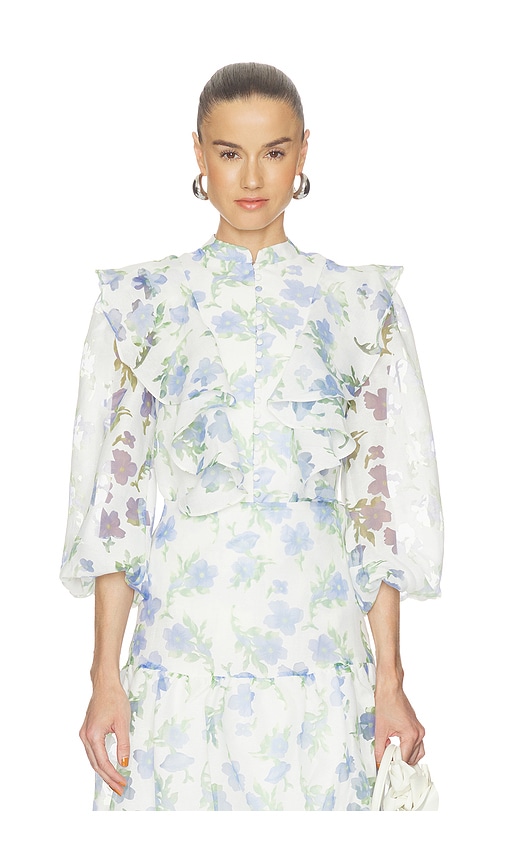 ELLIATT Cleo Top in Ivory,Blue. - size L (also in XS, S, M, XL) ELLIATT Cleo Top in Ivory,Blue. - size L (also in XS, S, M, XL) Self: 78.1% viscose 21.9% polyester Burnt: 100% polyester Lining: 100% rayon. Made in China. Dry clean only. Front loop button closure. Midweight chiffon fabric. Tiered ruf...more
