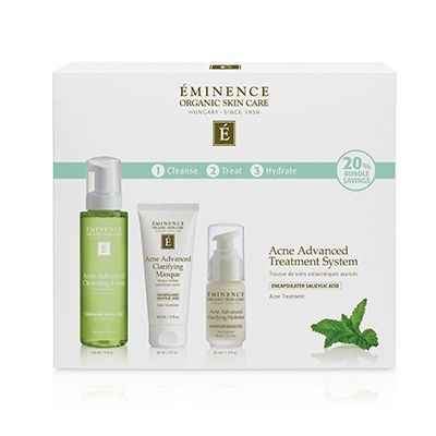 Eminence Organic Skin Care's Acne 3-Step Advanced Treatment System treats current acne issues and prevents future breakouts. This set includes full-sized versions of Eminence Organic Skin Care's Cleansing Foam, Clarifying Masque, and Clarifying Hydrator.The cleansing foam calms, hydrates, and protec...more