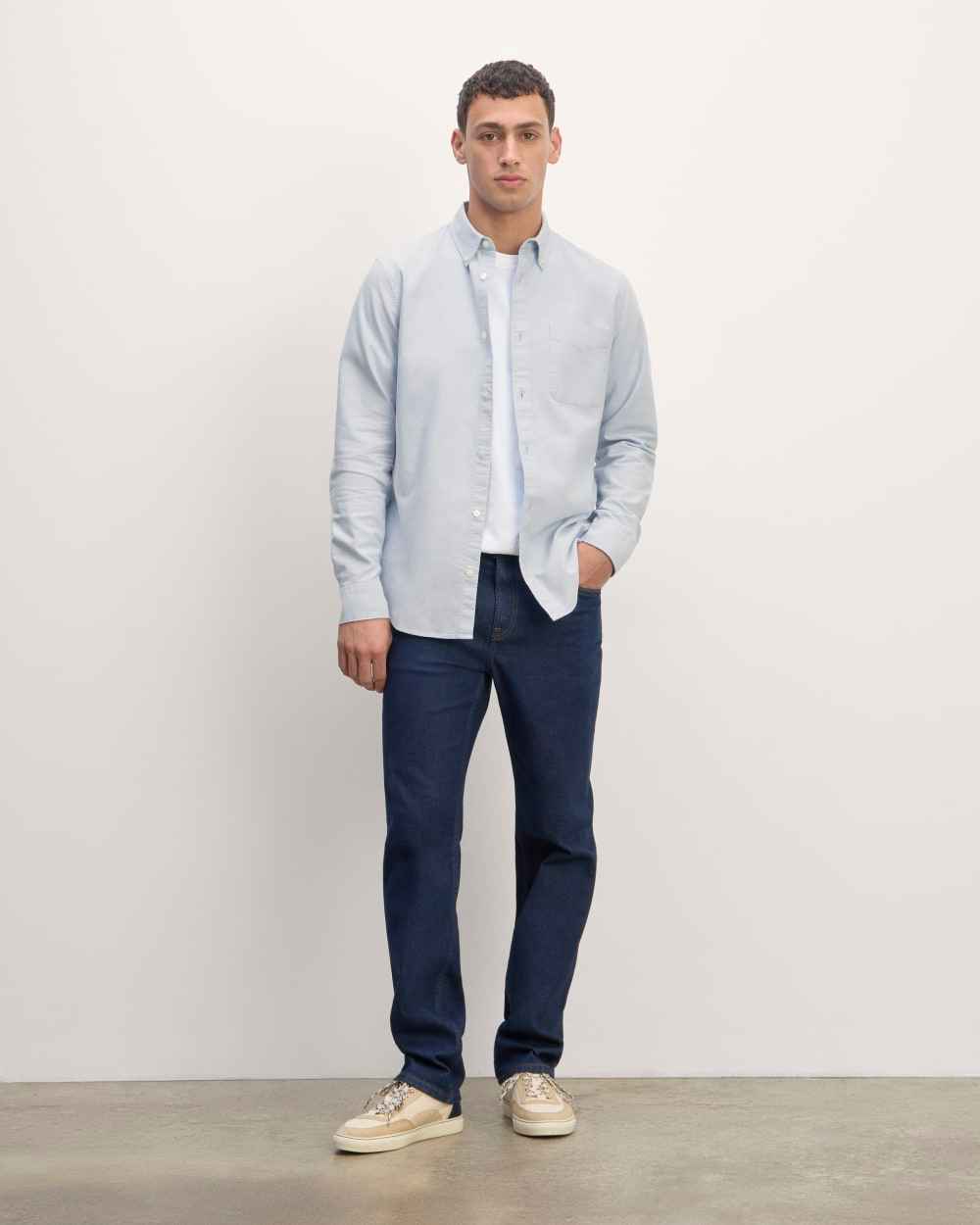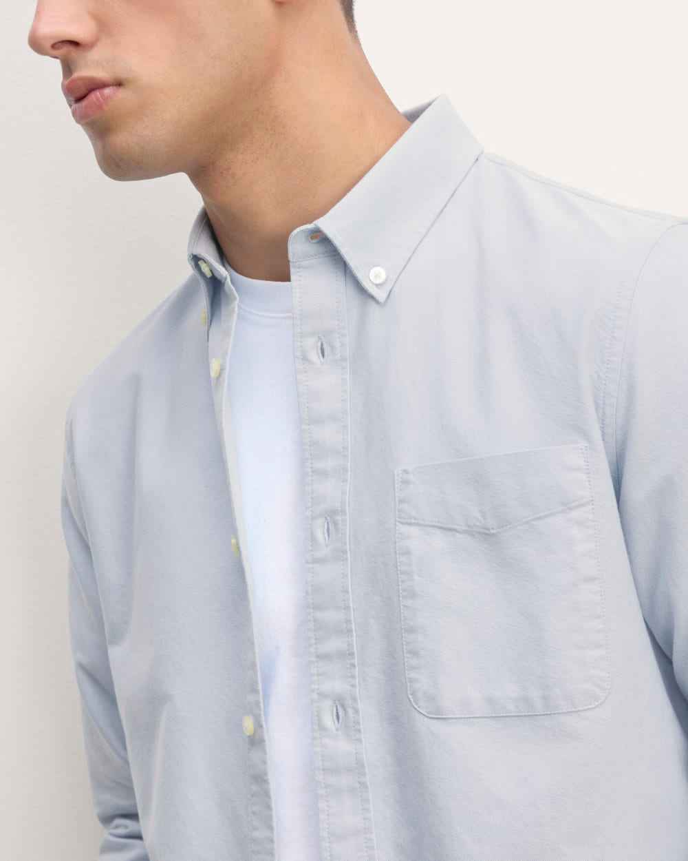 This piece features a button-down collar, button placket, slim fit, long sleeves, buttoned cuff and sleeve plackets, and chest pocket, in medium weight 40s organic cotton.