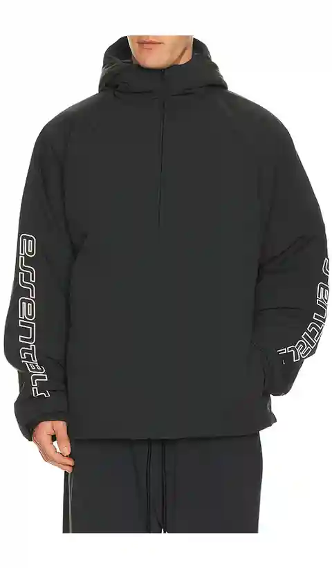 Fear of God ESSENTIALS Half Zip Anorak in Black. - size L (also in M, S, XL/1X) Fear of God ESSENTIALS Half Zip Anorak in Black. - size L (also in M, S, XL/1X) Self: 84% nylon 16% spandex Lining & Fill: 100% polyester. Hand wash. Front zipper closure. Attached hood. Side seam pockets with snap butto...more