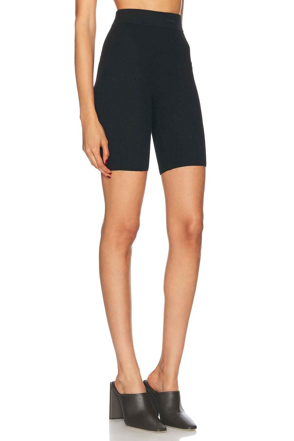Fear of God ESSENTIALS Waffle Biker Short in Black 88% polyester 12% nylon. Made in China. Hand wash. Pull-on styling with elastic waistband. High-waisted fit. Knit fabric. FALF-WF1. 192BT247260FW. About the designer:
