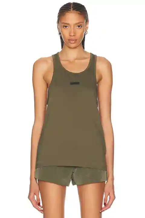 Fear of God ESSENTIALS Tank Top in Green 53% cotton 40% polyester 7% rayon. Made in China. Hand wash. Logo detail at front. Jersey fabric. FALF-WS5. 125BT245495FW. About the designer: