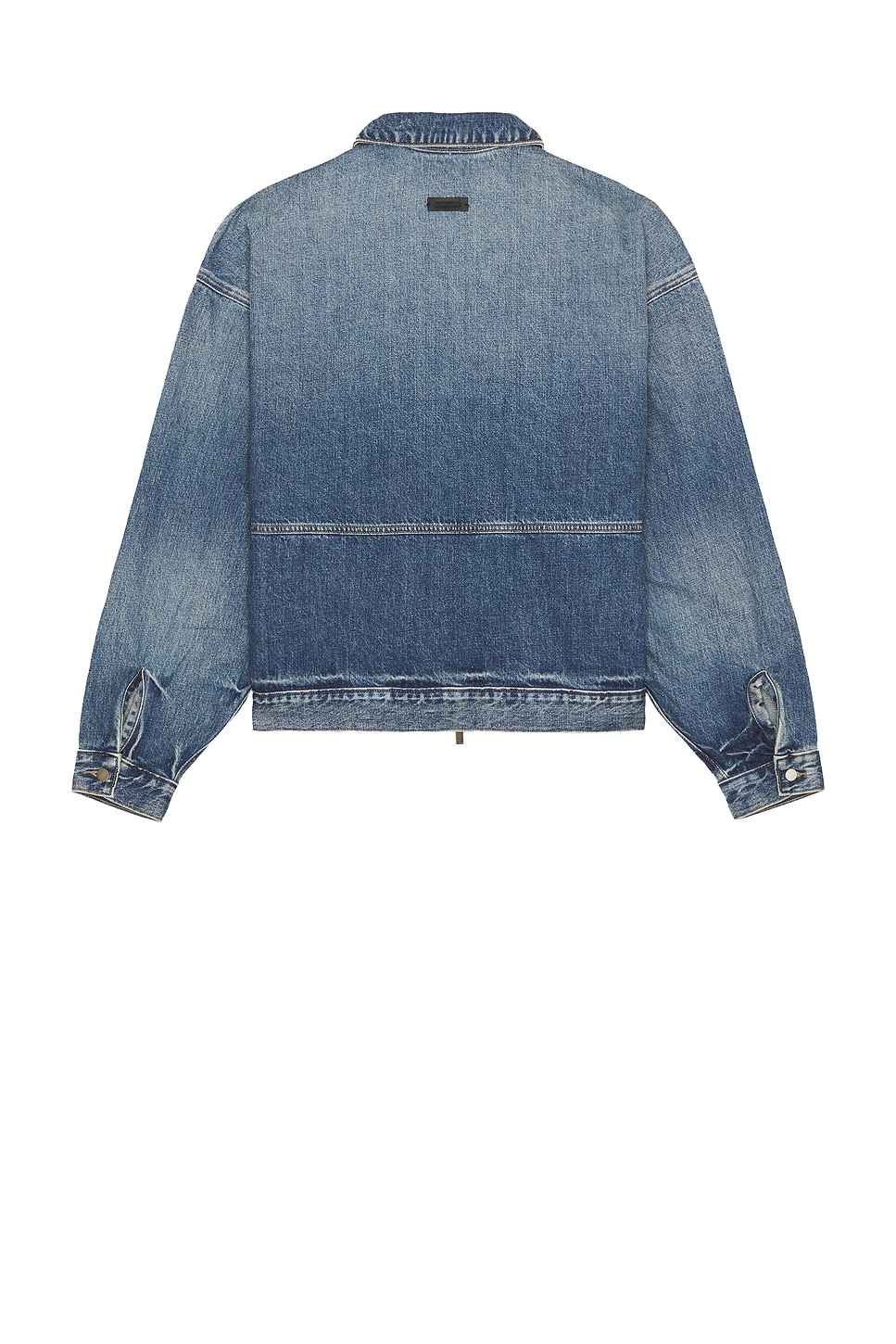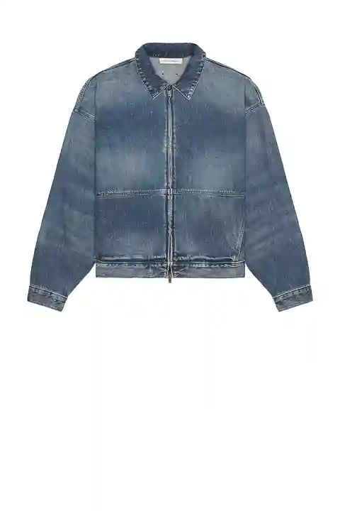 Fear of God ESSENTIALS Denim Trucker Jacket in Blue 100% cotton. Hand wash. Front zipper closure. Side seam pockets. Button cuffs. Midweight denim fabric. FALF-MO23. 202SP254270F. About the designer: